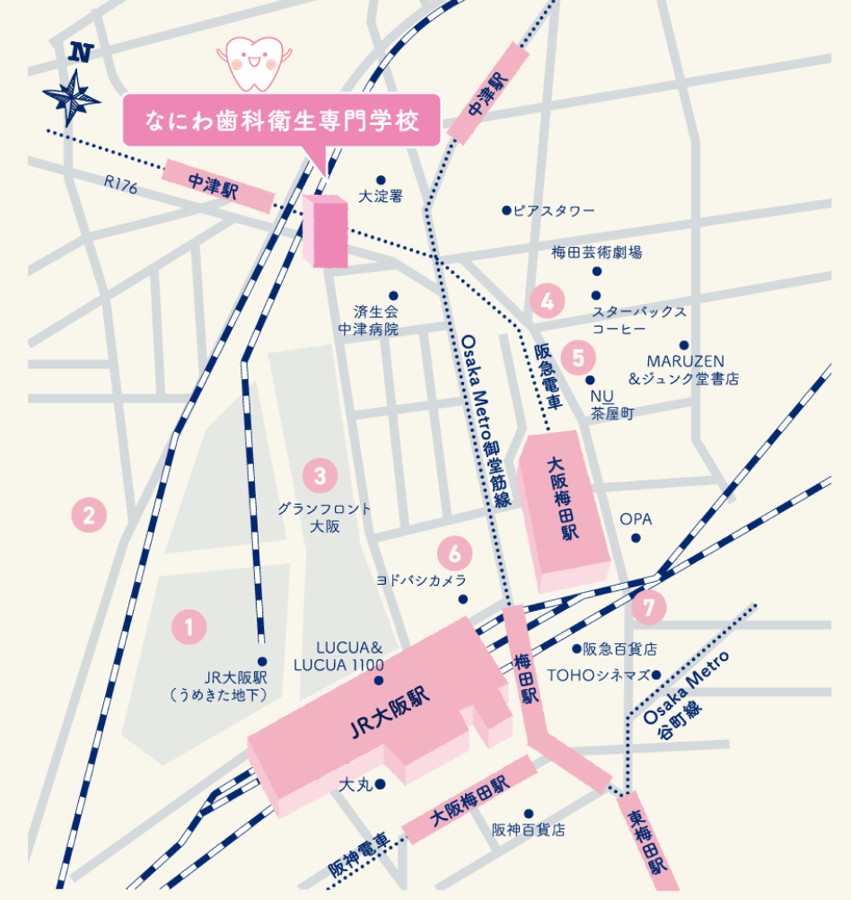 なにわ歯科衛生があるのは、大阪の中心地「梅田」。大阪駅や梅田駅からも近く、大阪府内はもちろん、京都や神戸からもアクセス抜群! 学びやすくて、充実した「都市型のキャンパスライフ」で、ステキな歯科衛生士を目指しましょう。