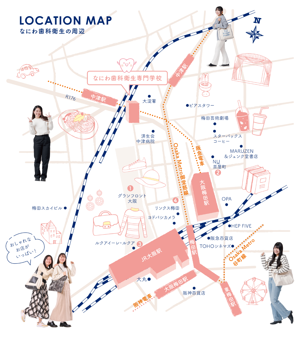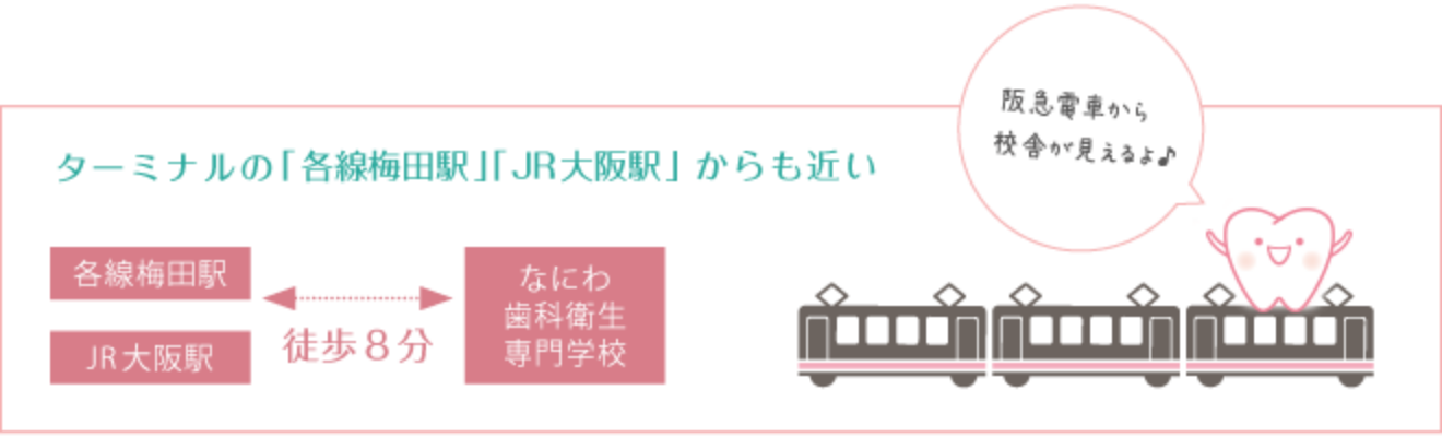 なにわ歯科衛生があるのは、大阪の中心地「梅田」。大阪駅や梅田駅からも近く、大阪府内はもちろん、京都や神戸からもアクセス抜群! 学びやすくて、充実した「都市型のキャンパスライフ」で、ステキな歯科衛生士を目指しましょう。