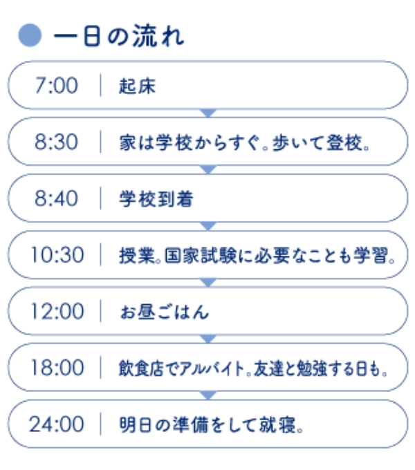 地元を離れて、一人暮らしをがんばる学生。歯科衛生士として働きながら、キャリアアップを目指す学生。なにわ歯科衛生にはさまざまな学生が学んでいます。彼女たちがどんな毎日を過ごしているのか、ここで少しのぞいてみましょう。