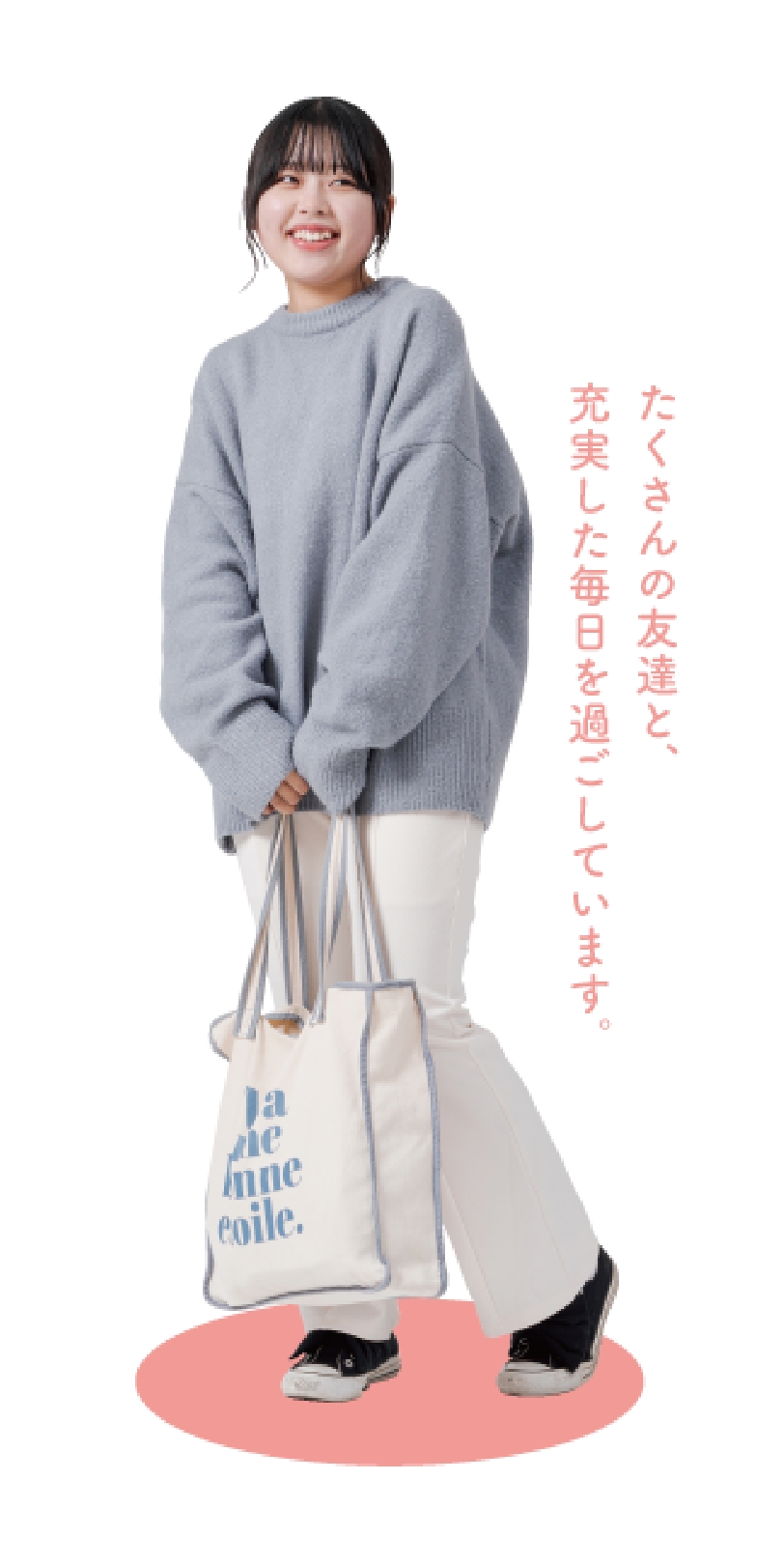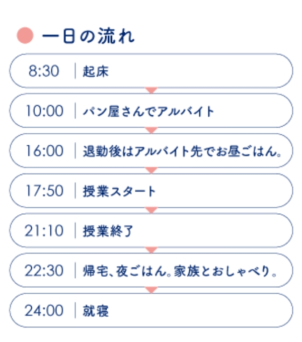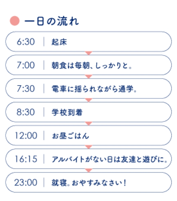 - 放課後はアルバイトをがんばったり、クラスのみんなで遊びに行ったりしています。休日は地元の友達と一緒に過ごしています。オンとオフのメリハリは、いつもとても大事にしています。