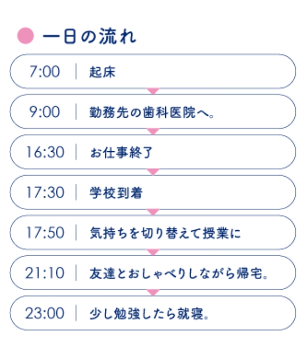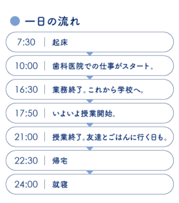 - 仕事がある日は、歯科助手としてたくさんの患者さんと向き合っています。学校も仕事もお休みの場合は、友達と買い物に行ったり、家でのんびりと過ごしていることが多いです。