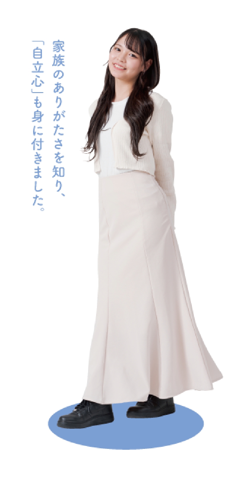 - 下宿先が学校から近いので、通いやすいです。また、一人暮らしをはじめてからは、炊事も洗濯も、すべてのことを自分でしないといけないので、家族のありがたさを改めて知って、社会人としても成長できました。