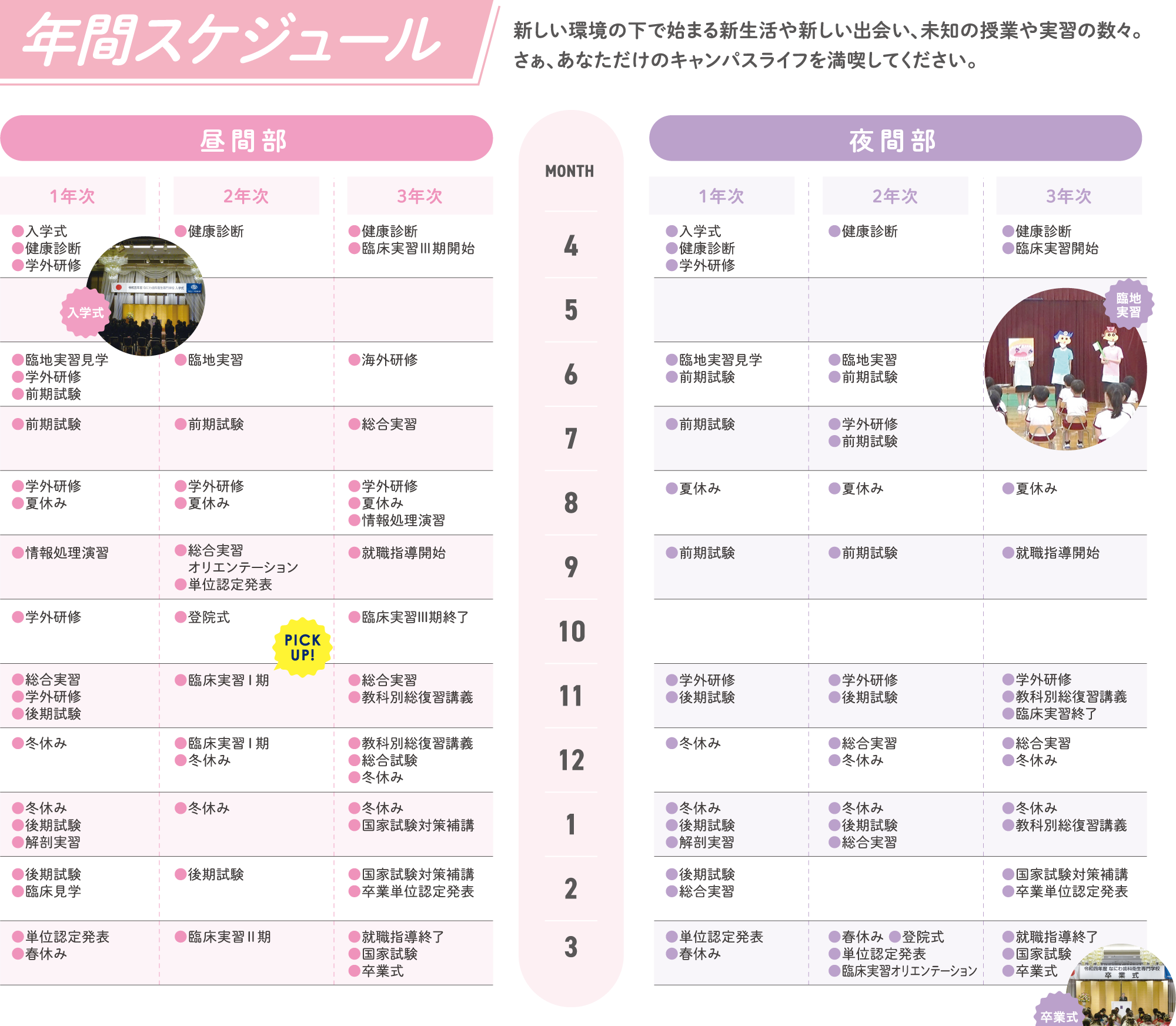なにわ歯科衛生専門学校の3年間で経験する生活をカレンダー形式でご紹介します。