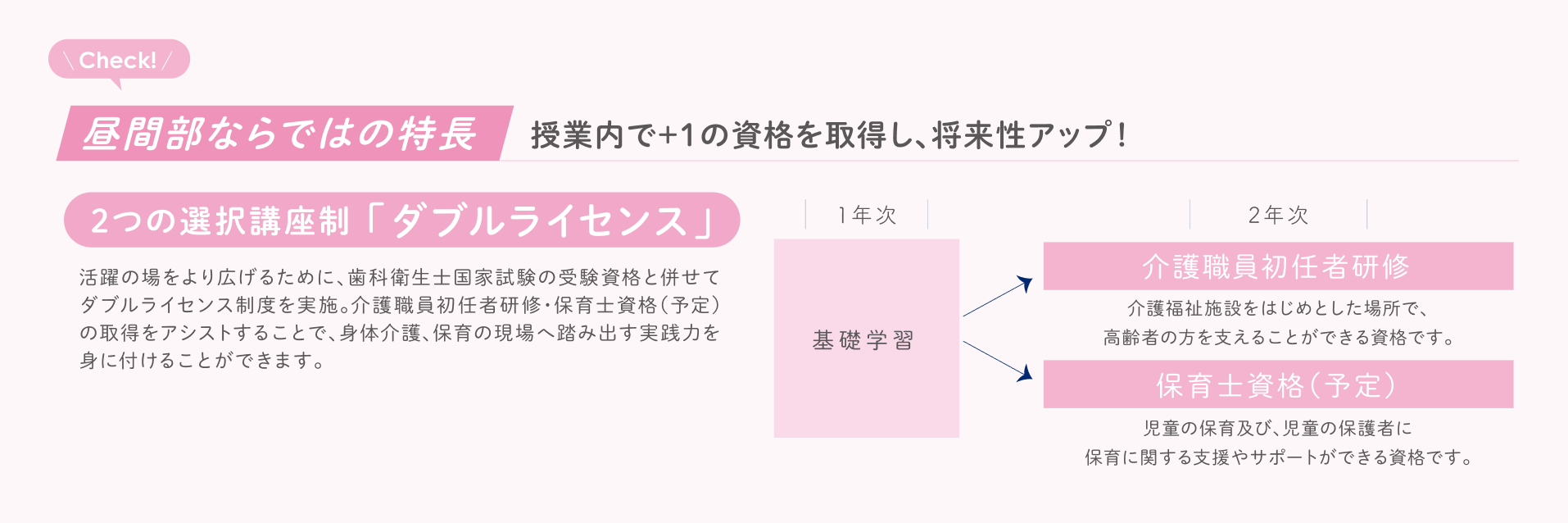 昼間部では、基礎的な技術や知識から最先端の歯科医療までを、じっくり幅広く学べる学習環境を整えています。充実したカリキュラムを通じて、3年後には学生一人ひとりを希望する進路へとつないでいきます。さらに、ダブルライセンスで多くの道が開ける学びも展開しており、将来の可能性をより大きく広げられます。