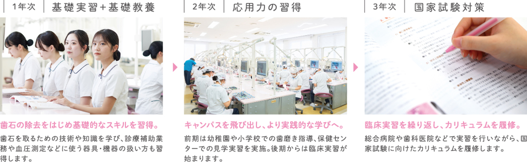 | 2年次 | 口腔衛生学2/歯科臨床概論2/矯正歯科学/障害者歯科・高齢者歯科学/歯周予防処置法2/齲蝕予防処置法2/歯科保健指導論2/栄養指導/歯科診療補助論2/歯科理工/感染予防論 /臨地実習 | 社会福祉/歯科臨床概論2/障害者歯科・高齢者歯科学/歯周予防処置法2/歯科保健指導論2/歯科保健指導論3/歯科診療補助論2/臨床実習2 | |