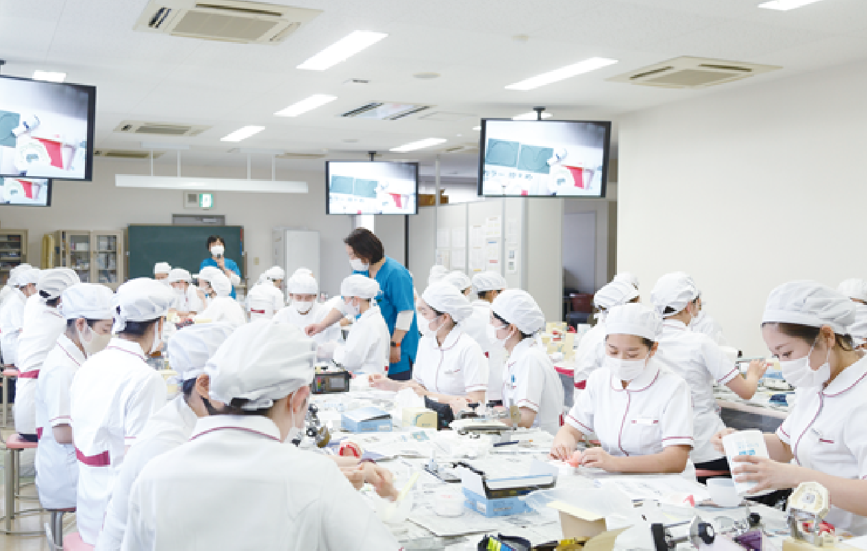 また、器具や材料の消毒や洗浄、管理、感染リスクについての理解を深めながら、学生同士の相互実習へと臨みます。