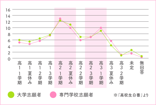 「進路について考えるのは、まだ先」「3年生になってからしっかり考えて決めたらいい」と思っていませんか?グラフを見ても分かるように、高校1・2年生の皆さんにもあっという間に進路を考えるタイミングがやってきます!
